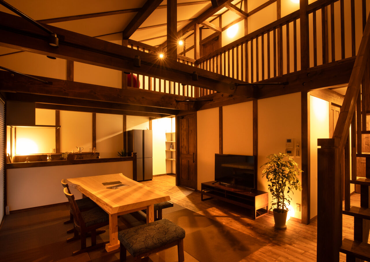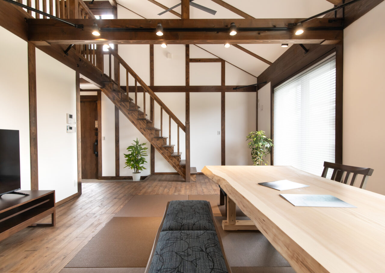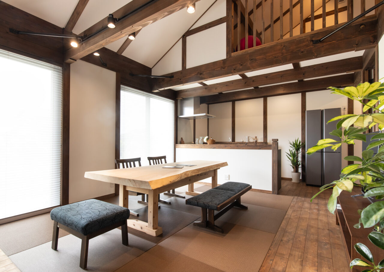 日本の伝統工法【真壁づくり】の特徴である、柱や梁が現しとなった室内では木のぬくもりや香りで心地良い時間が流れます。